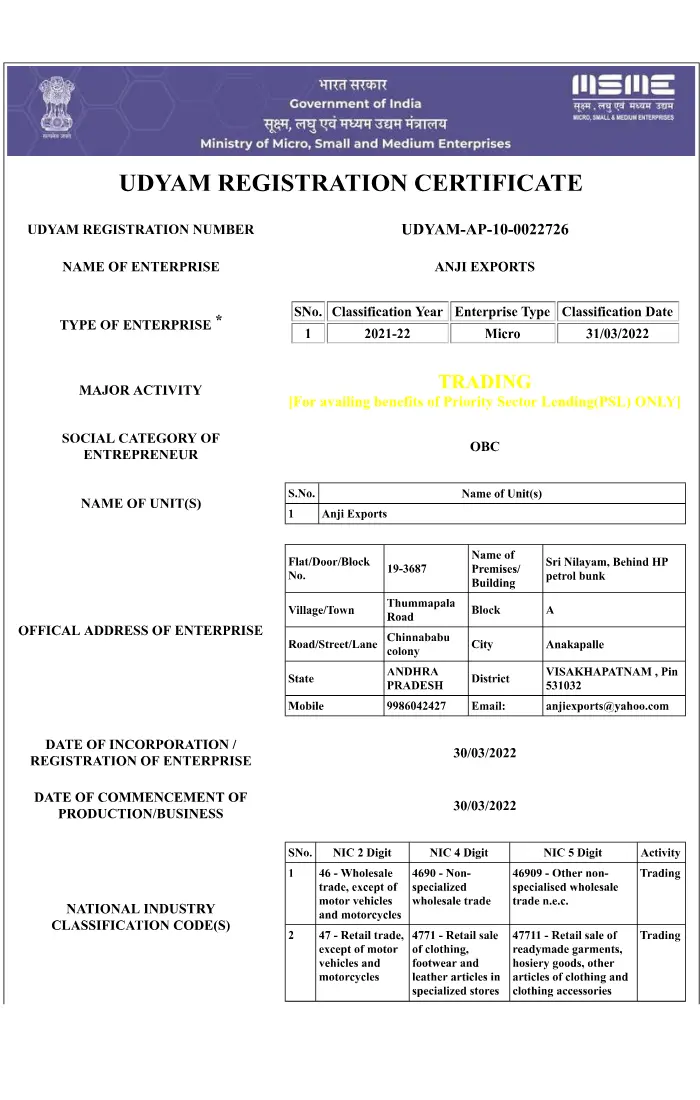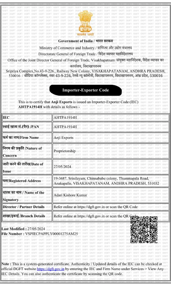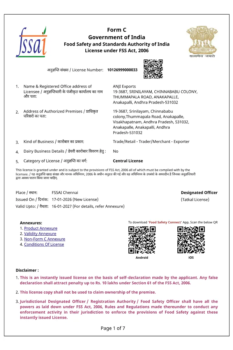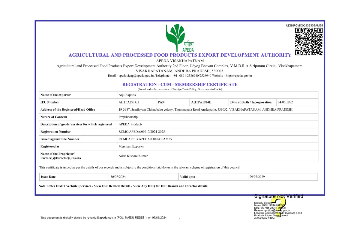 Anji Exports is a registered and compliant export company holding key certifications including IEC, GST, APEDA, FSSAI, FIEO, and UDYAM Registration. These credentials reflect our commitment to quality, regulatory compliance, and ethical international trade.